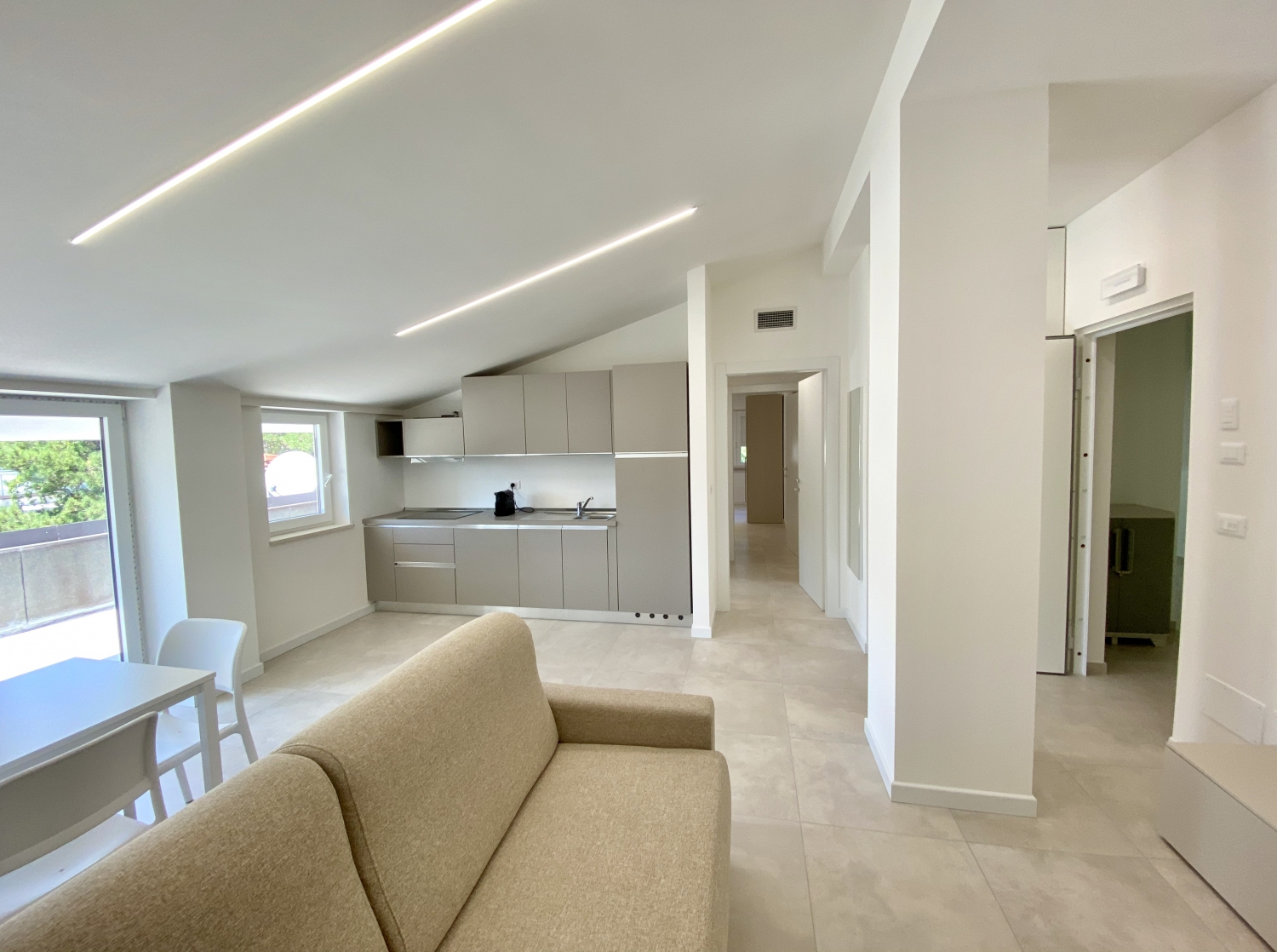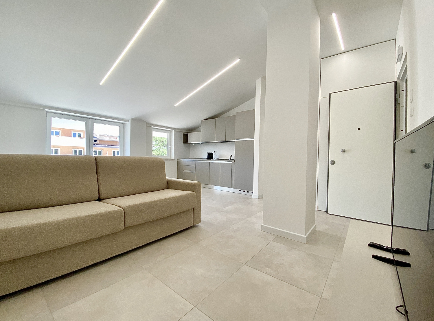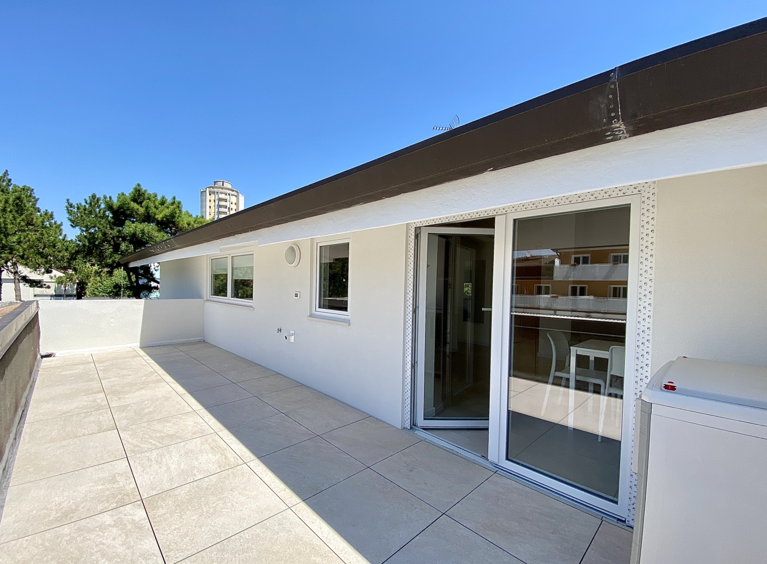 Grande appartamento trilocale di 60 metri quadrati, per massimo 6 posti letto che comprende 2 camere: 1 camera da letto con letto alla francese, 1 grande camera con letto matrimoniale. L’unità e composta da 1 bagno, un grande soggiorno con cucina e divano letto, il tutto con vista panoramica sulla terrazza. Nella cucina è presente una porta finestra che si apre direttamente sulla terrazza solarium di ben 25 metri quadrati, anche in tutte le altre aree dell’appartamento è presente una finestra. Tutte le stanze sono servite da impianto di aria condizionata canalizzato regolabile, nelle giornate fredde oppure nei mesi invernali è possibile usufruire della pompa di calore per il riscaldamento. L’entrata dispone di una porta blindata. In tutte le zone è disponibile la connessione Wi-Fi.