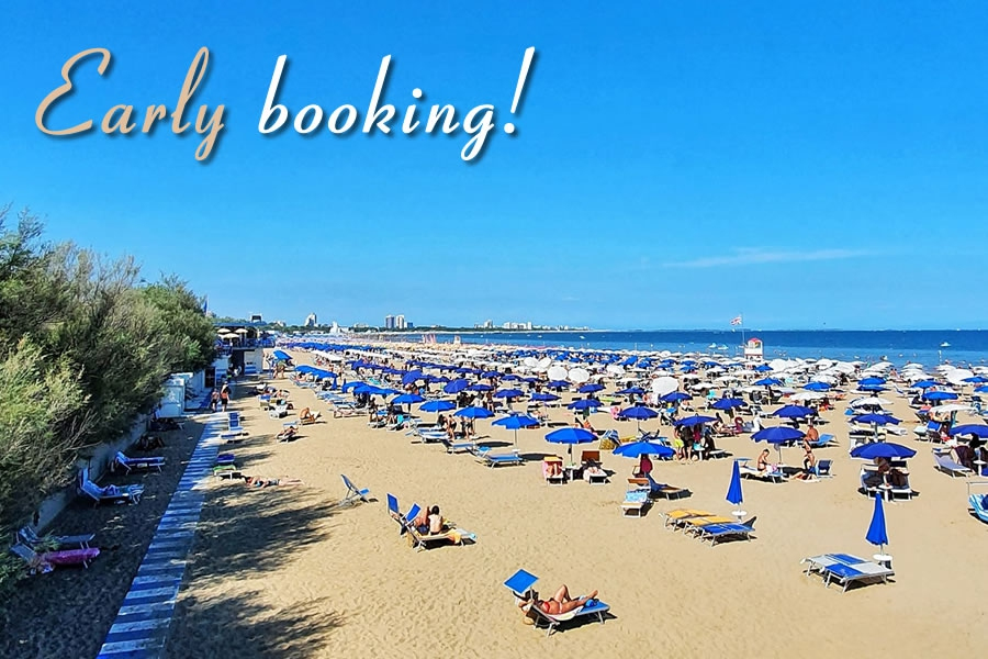 Prenotando nelle date che vanno dal 01/01 al 30/03, con soggiorni di minimo una settimana, nei periodi che vanno da maggio a Luglio, avrete diritto ad uno sconto del 10% sul totale della spesa prevista per il soggiorno della vostra vacanza a Lignano. Offerta valida solo con pagamento anticipato e con prenotazione da questo sito web.